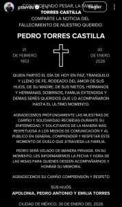 Rosario Robles dijo: “Me entristece la partida de Pedro Torres. Siempre sentí por él admiración y respeto por su labor profesional, pero sobre todo cariño, pues nos unían nuestras raíces coahuilenses. Descanse en paz”.