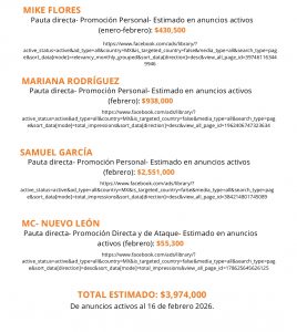 Entre diciembre y febrero, el gobernador de Nuevo León, Samuel García, junto con Mariana Rodríguez y el funcionario estatal Mike Flores, destinaron al menos 3.9 millones de pesos en publicidad en Facebook e Instagram, de acuerdo con registros públicos de la Biblioteca de Anuncios de Meta.