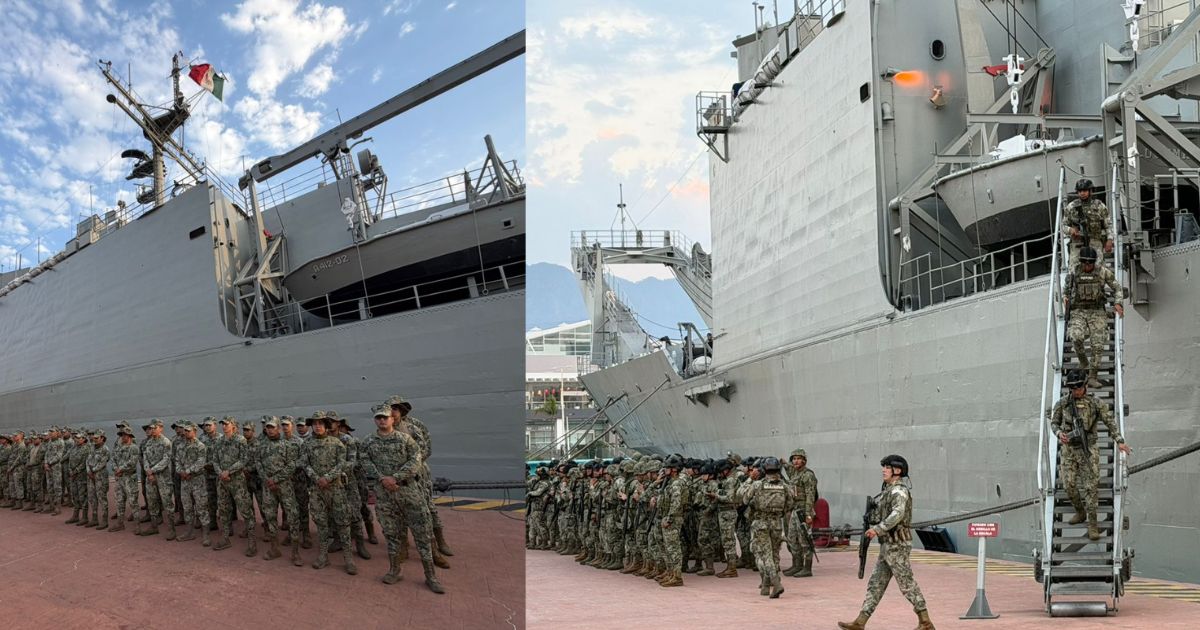 Arriba buque con personal de Infantería de Marina para reforzar la seguridad, en Puerto Vallarta, Jalisco