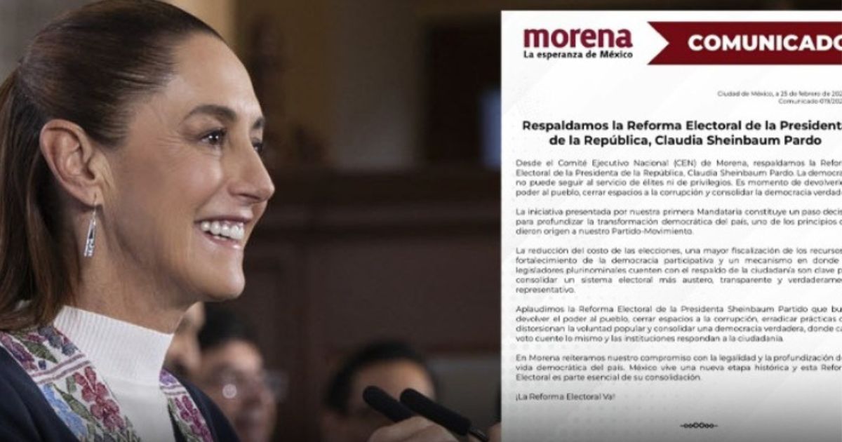 Ciudad de México.- A través de un comunicado, el partido Morena respaldó la propuesta de Reforma Electoral enviada por la Presidenta Sheinbaum, asegurando que “la democracia no puede seguir al servicio de élites ni privilegios”, por lo que se deberán cerrar espacios a la corrupción y consolidar la democracia verdadera.