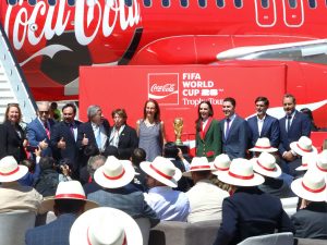 Después de una presentación, los encargados de develar la copa tras su bajada del avión de Coca Cola fueron Hugo Sánchez y el argentino Roberto Ayala, quien fue el único que pudo posar con ella en brazos.