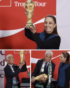 LA PRESIDENTA DE MÉXICO CARGÓ EL TROFEO ORIGINAL JUNTO A BEBETO; FIFA Y COCA-COLA DESTACAN ALIANZA HISTÓRICA RUMBO AL MUNDIAL 2026 EN MÉXICO.