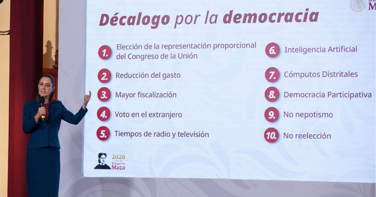 Ciudad de México.- No hubo estridencias ni amenazas veladas. Desde el templete de Palacio Nacional, la presidenta Claudia Sheinbaum habló con tono sereno, casi pedagógico, para presentar su propuesta de reforma electoral, a la que bautizó como el “Decálogo por la Democracia”.