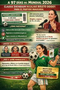 Ciudad de México.- A 97 días de que ruede el balón en la Copa del Mundo 2026, la presidenta anunció que el boleto que recibió para el partido inaugural será regalado mediante un concurso dirigido a jóvenes futbolistas del país.