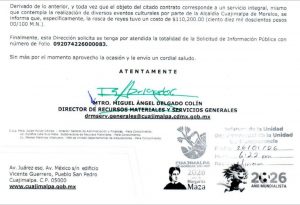Los ciudadanos respaldaron la denuncia con documentos obtenidos mediante una solicitud de transparencia, donde la alcaldía reconoce el monto destinado para este evento. Según el oficio emitido por la Dirección de Recursos Materiales y Servicios Generales, el gasto es parte de un contrato de servicio integral para hacer eventos culturales. Ahí se incluyó específicamente la celebración del Día de Reyes. Ahí se precisa que “la rosca de Reyes tuvo un costo de 110 mil 200 pesos”, información que fue entregada como respuesta a la solicitud de acceso a la información con folio 09207422600083. La respuesta fue firmada por Miguel Ángel Delgado Colín, director de Recursos Materiales y Servicios Generales de la alcaldía.