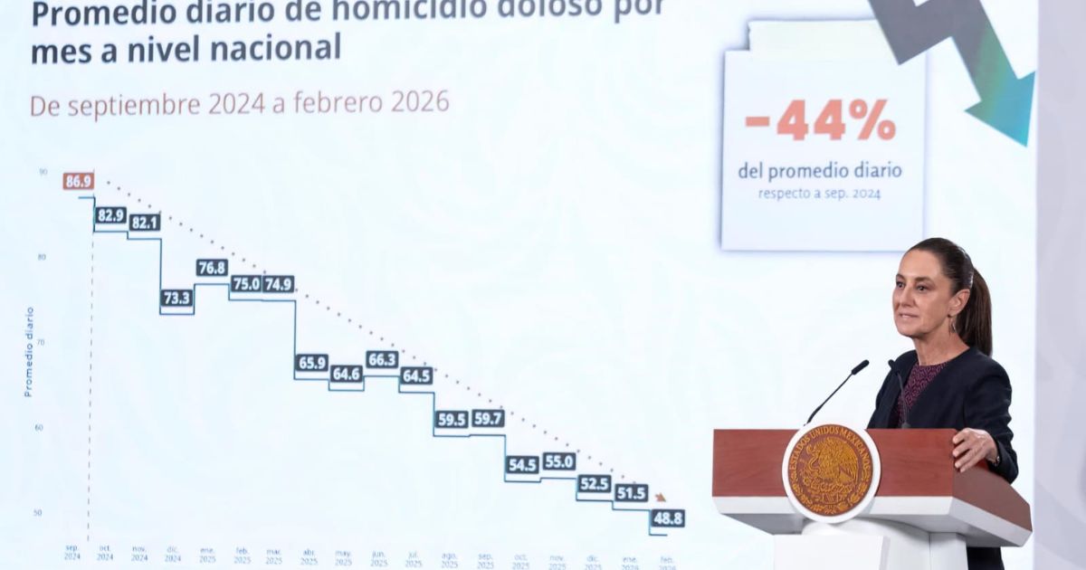 Febrero de 2026 es el mes con la menor cifra de homicidios diarios en al menos la última década, con un promedio de 48.8 asesinatos por día; es decir, 38 casos menos diarios que en septiembre de 2024, donde el promedio era de 86.9.