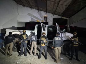Durante la intervención en el inmueble fueron detenidas dos personas y se aseguraron 33 vehículos de transporte público foráneos, placas con reporte de robo, herramientas y juegos de llaves, así como dos camionetas con modificaciones de blindaje artesanal.