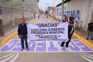 La alcaldesa Azucena Cisneros Coss inauguró cinco calles en la colonia San Francisco de Asís, tres en Ejidos de San Andrés y una en Potrero del Rey, todas en la zona norte del municipio y pavimentadas por primera vez a unos 30 años de su creación.