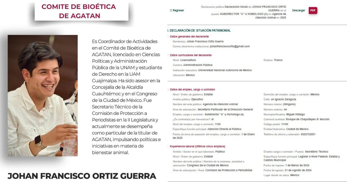 Ciudad de México.- Un nuevo señalamiento de presunto nepotismo sacudió a la Agencia de Atención Animal (AGATAN), luego de que la activista Lucía Hernández, del proyecto Amo La Ciencia, denunciara en redes sociales la designación de un colaborador cercano de la titular del organismo en un área clave.