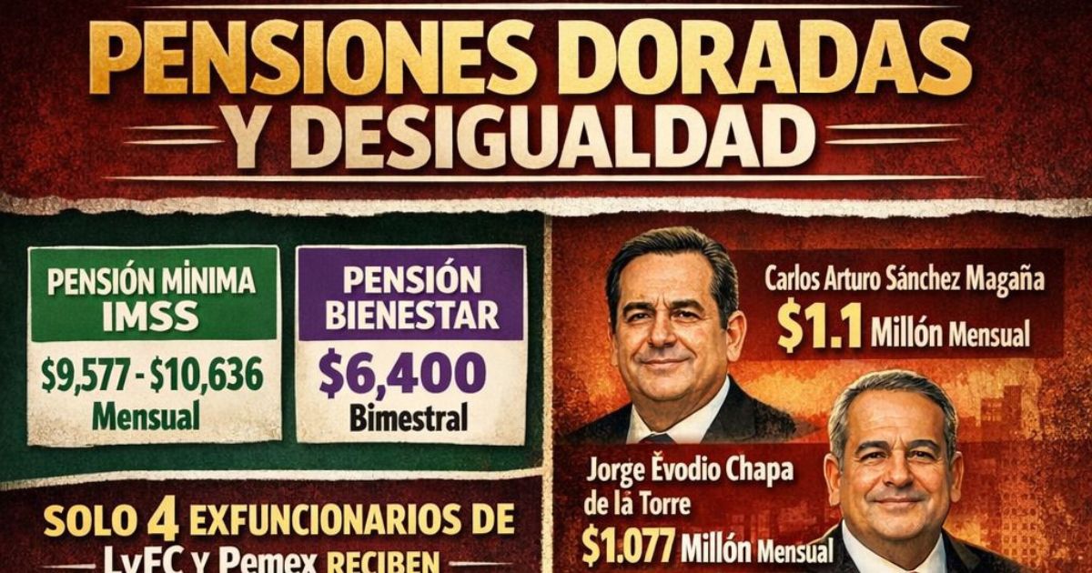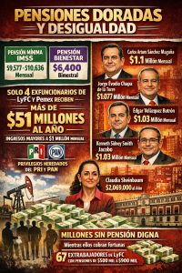 Ciudad de México.- Las pensiones doradas exhiben la desigualdad en México. Mientras la mínima del IMSS ronda entre 9 mil 577 y 10mil 636 pesos mensuales y la Pensión Bienestar es de 6 mil 400 bimestrales, un grupo reducido de 4 exfuncionarios de LyFC y Pemex mantiene privilegios heredados de gobiernos del PRI y PAN, quienes recibieron más de 51 millones de pesos al año, con ingresos mensuales superiores al millón, muy por encima del ingreso de la presidenta Claudia Sheinbaum, quien percibe 2 millones 69 mil pesos al año.