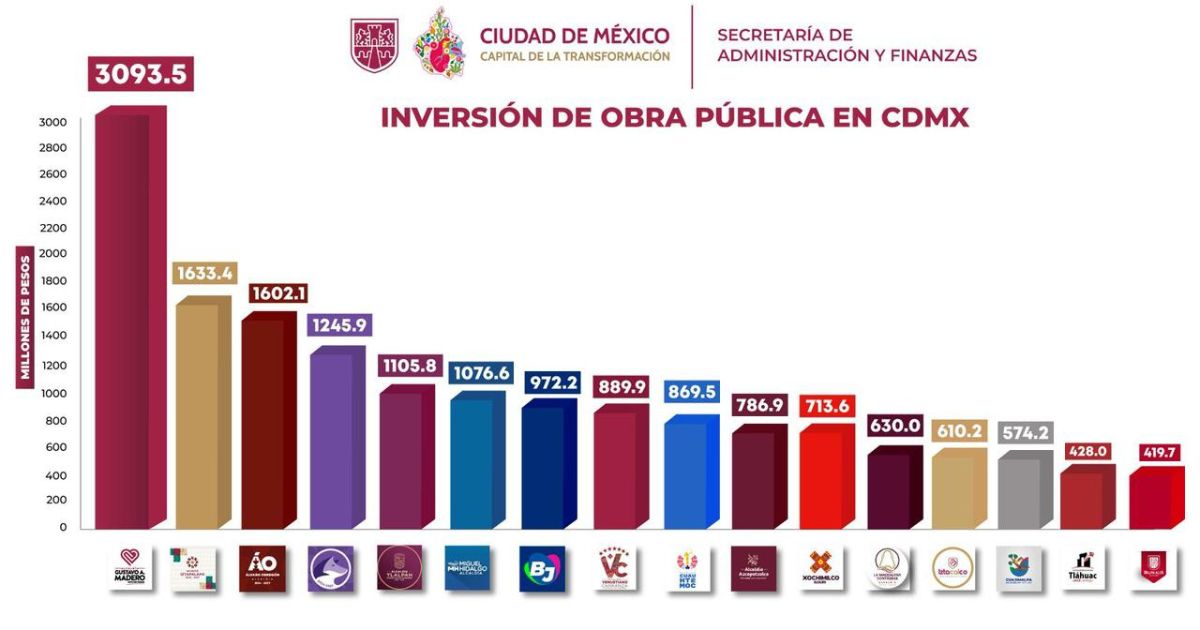 La inversión destinada a obra pública en la Ciudad de México muestra fuertes contrastes entre alcaldías, donde algunas demarcaciones concentran recursos superiores a los mil millones de pesos, mientras otras reportan montos considerablemente menores para infraestructura urbana.