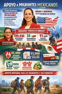 Sumado a lo anterior, la secretaria de Gobernación, Rosa Icela Rodríguez Velázquez, destacó los avances del programa “México te Abraza”, que articula a 34 dependencias para recibir a connacionales repatriados. Hasta el 18 de marzo de 2026, se han registrado 189 mil 830 repatriaciones: 154 mil 72, por vía terrestre y 35 mil 758, por vía aérea.