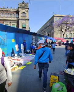 A los pies de Palacio Nacional, se mantiene el muro metálico para evitar que lleguen a la cercanía de este inmueble, pero la barda ya es usada por los comerciantes para exhibir sus productos, mismos que son consumidos por los miembros del magisterio, pero también por los paseantes que deambulan por el lugar.