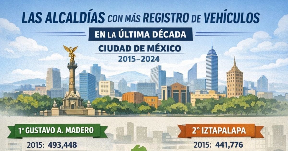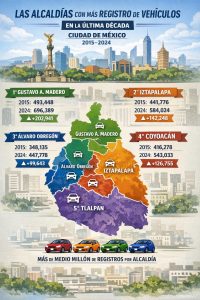 Ciudad de México.- En la última década, el parque vehicular en la capital del país ha crecido de manera sostenida en las alcaldías Gustavo A. Madero, Iztapalapa, Álvaro Obregón, Coyoacán y Tlalpan, concentrando el mayor número de unidades y marcando el ritmo del tránsito en la metrópoli.