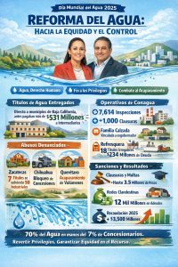 Ciudad de México.- En el marco del Día Mundial del Agua, que fue el 22 de marzo, el Gobierno Federal puso cifras sobre la mesa: ha habido 7,614 inspecciones, más de mil clausuras, 531 mdp pagados a intermediarios, 18 títulos irregulares con adeudos por 234 millones, multas de hasta 3.5 millones y un pasivo nacional de 12 mmdp. Con la nueva Ley de Aguas y las reformas a la Ley de Aguas Nacionales, aprobadas en diciembre de 2025, Sheinbaum afirmó que se rompe el esquema de privilegios instaurado desde 1992.