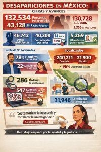 Pese al panorama, ha habido avances: de las 394 mil 645 desapariciones entre 1952 y 2026, ya se halló a 262 mil 111. De ellas, 240 mil 211 fueron encontradas con vida. Asimismo, 31 mil 946 personas han sido localizadas desde octubre de 2024 hasta el día de hoy.