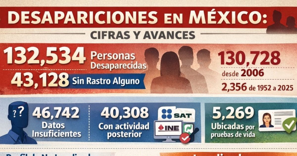 Pese al panorama, ha habido avances: de las 394 mil 645 desapariciones entre 1952 y 2026, ya se halló a 262 mil 111. De ellas, 240 mil 211 fueron encontradas con vida. Asimismo, 31 mil 946 personas han sido localizadas desde octubre de 2024 hasta el día de hoy.