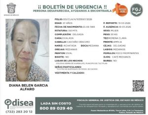 La mujer fue vista por última vez el 18 de marzo de 2026, por lo que fue reportada como desaparecida ante la Fiscalía General de Justicia del Estado de México (FGJEM), la cual activó la ficha de búsqueda ODI/CUA/A/1033067/2026 el 20 de marzo, donde se indica que desapareció en la colonia Sierra de Guadalupe, en el municipio de Tultitlán, pero se desconocía la vestimenta y calzado que traía.