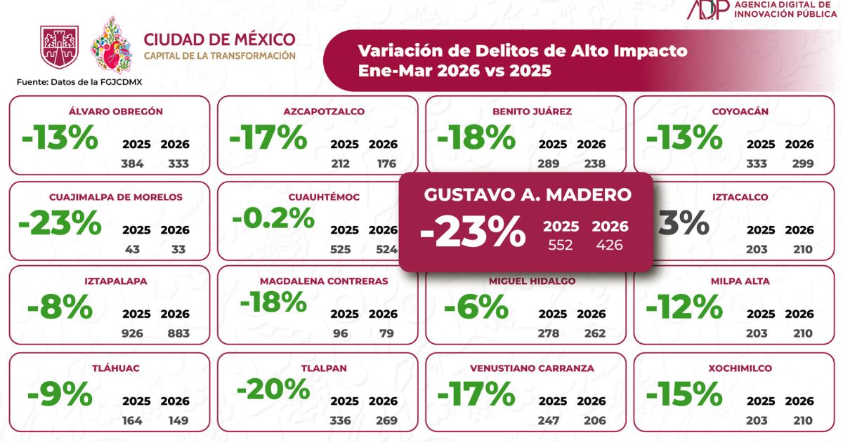 Datos de la Fiscalía General de Justicia (FGJ) demuestran que GAM tuvo una reducción en delitos de alto impacto de 23% en marzo de 2026 con respecto al año anterior, colocándose como la alcaldía con mejores resultados en este rubro.