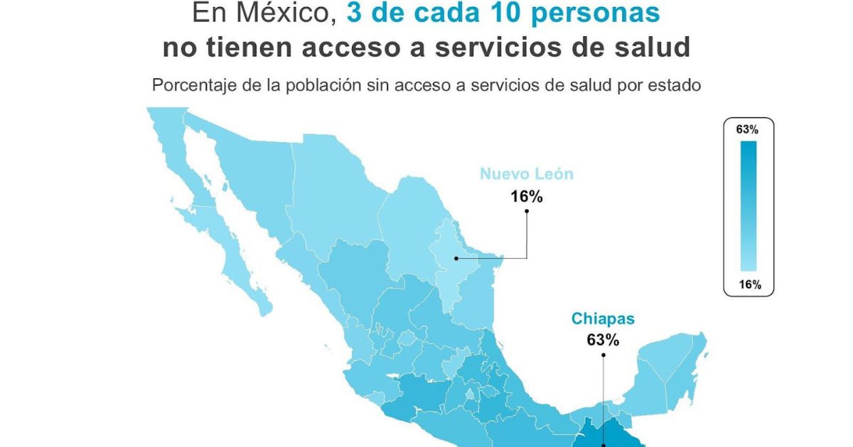 La cifra no solo refleja un rezago generalizado, sino también una profunda desigualdad territorial, ya que el contraste más evidente se da entre Chiapas, donde el 63% de la población carece de acceso a servicios de salud, y Nuevo León, con apenas 16%.