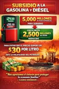 Ciudad de México.- El Gobierno Federal destina 5 mil millones de pesos semanales para subsidiar la gasolina Magna y el diésel, aunque el costo neto se reduce a 2 mil 500 millones, informó la presidenta Claudia Sheinbaum. Con esta medida se busca evitar que el precio del litro supere los 30 pesos, en medio de la volatilidad internacional del petróleo por el conflicto en Medio Oriente.