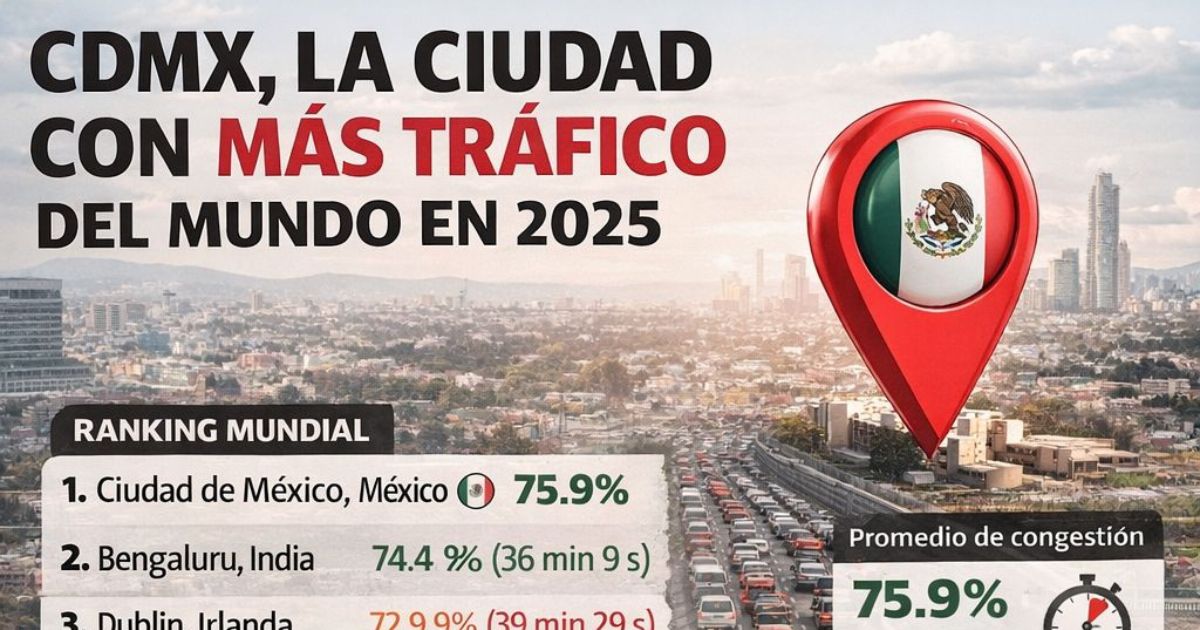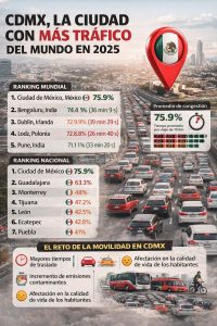 Ciudad de México.- La Ciudad de México se posicionó como la urbe con mayor congestión vehicular a nivel global, de acuerdo con el Índice de Tráfico 2025 de TomTom. Con un promedio de 75.9% de congestión, la capital del país encabeza el ranking mundial, superando a ciudades de alto crecimiento como Bengaluru y Dublín.