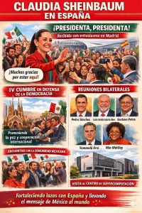 Este viaje representa uno de los primeros acercamientos internacionales que ha tenido Claudia Sheinbaum como presidenta y consolida la relación con España, proyectando a México como un actor clave en los debates globales.