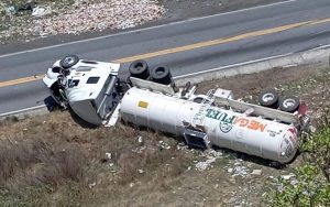 Una pipa cargada con combustible volcó la tarde del viernes sobre la carretera Toluca-Naucalpan, lo que provocó el cierre parcial de la circulación y la formación de largas filas de vehículos en dirección a Naucalpan. El accidente ocurrió en el paraje El Almacén, donde la unidad pesada perdió el control y terminó recostada sobre su costado izquierdo, con la cabina invadiendo uno de los carriles.