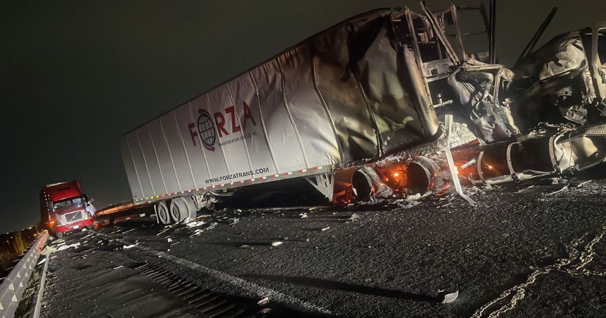 El mortal incidente ocurrió en el kilómetro 59 +500, en la colonia San Buenaventura, donde uno de los tractocamiones perdió el control e impactó al otro; tras el fuerte golpe una de las unidades se incendió.