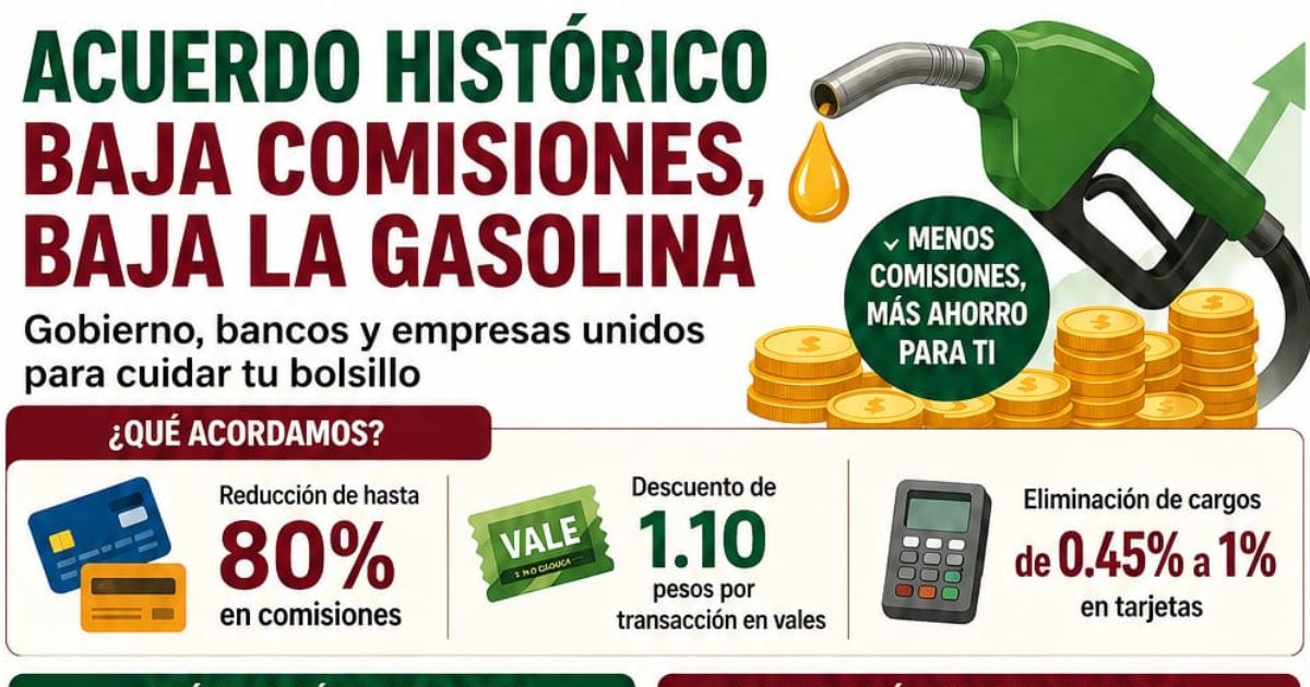 Ciudad de México.- Con una reducción de hasta 80% en comisiones, descuentos de $1.10 por transacción en vales y eliminación de cargos del 0.45% al 1% en tarjetas, el Gobierno anunció un acuerdo con bancos y empresas de vales para reducir comisiones en la compra de combustibles. La medida, que inicia el 1 de mayo, se suma a un estímulo fiscal semanal de 2 mil 500 mdp, clave para mantener la Magna por debajo de $24 y el diésel alrededor de $28 por litro.