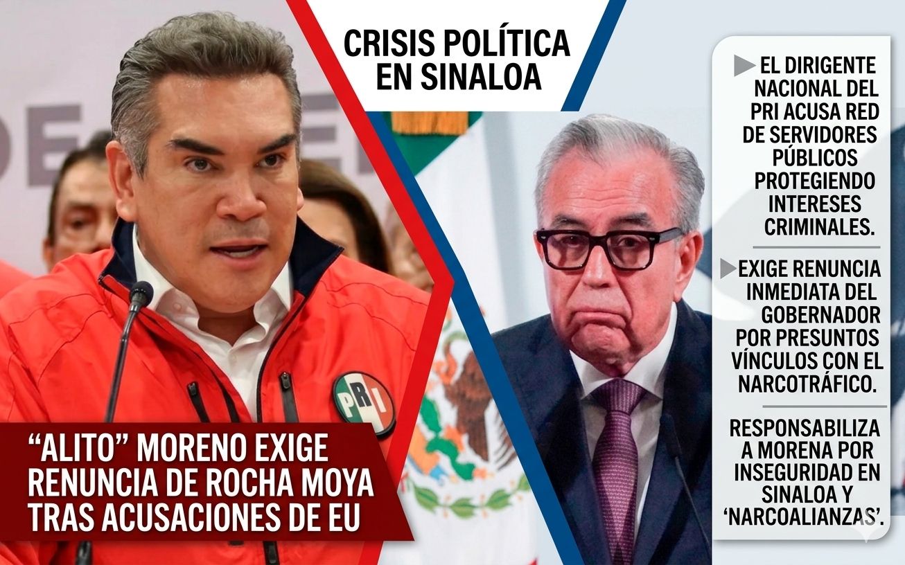 El dirigente nacional del PRI, Alejandro Moreno Cárdenas, exigió la renuncia inmediata del gobernador de Sinaloa, Rubén Rocha Moya, tras las acusaciones dadas a conocer por autoridades de Estados Unidos sobre presuntos vínculos con el narcotráfico.